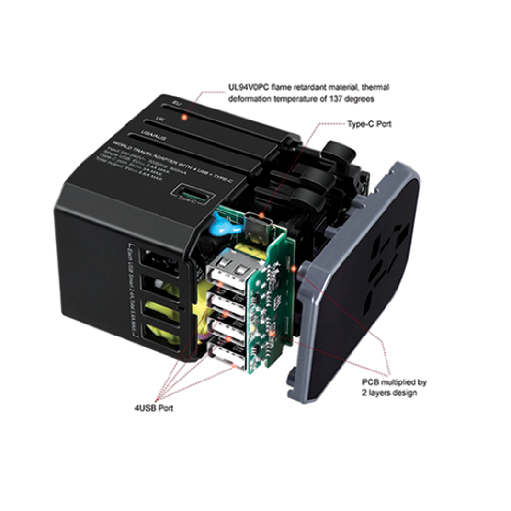 - Supports global plug types (US, UK, AUS, EU)